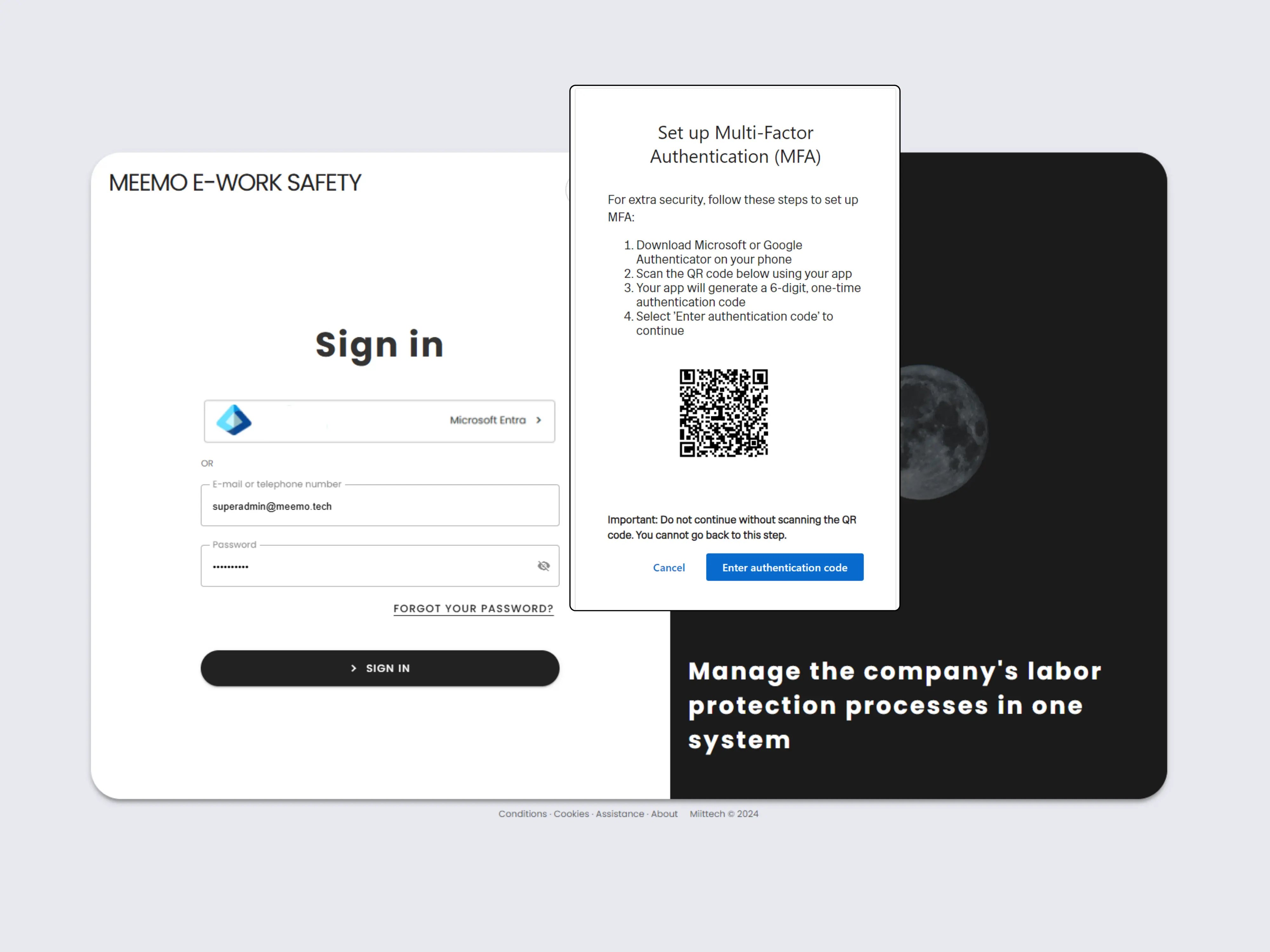 Log in to the system via SSO, email, or phone number. For security— 2FA.